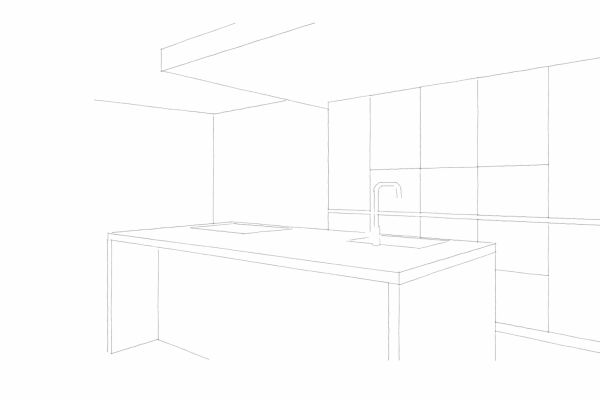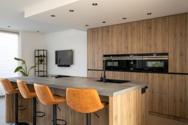 De keuken is zeer ruimtelijk ingedeeld en heeft voldoende plaats om tevens als eetgedeelte te fungeren. De oude keuken is vervangen door een op maat gemaakte keuken volledig naar inzicht en de wensen van onze opdrachtgever. Door een kookplaat met geïntegreerde afzuiging toe te passen ontstaat er vrij zicht naar de woonkamer. Elk project is uniek en zo ook, deze moderne keuken in combinatie met beton en hout.
