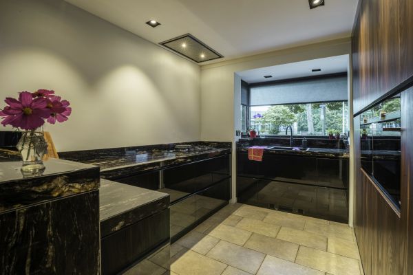 De hoge kastenwand met een op maat gemaakte paslijst heeft een warme uitstraling en biedt voldoende opbergruimte. Het natuursteen aanrechtblad is robuust en uniek, het aanrechtblok heeft hoogglans zwarte fronten. Deze combinatie van diverse materialen vormen samen deze exclusieve en luxe keuken.